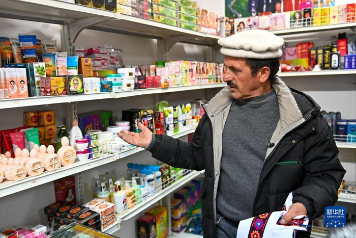 在新疆喀什地区塔什库尔干塔吉克自治县,巴基斯坦商人艾合买迪拉·别克为顾客介绍他从红其拉甫口岸带来的巴基斯坦商品(11月5日摄)。