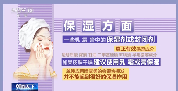 如果皮肤干燥,建议使用乳、霜或膏保湿,单纯应用喷雾类的,喷到脸上后液体会很快挥发,并不能起到很好的保湿作用。
