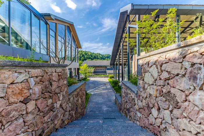 进入民宿,一大片错落有致的石墙青瓦映入眼帘,院落依山势而建。不远处,还有视野极佳的落地玻璃窗。古典与现代的完美交融,为民宿注入了流动的诗意。