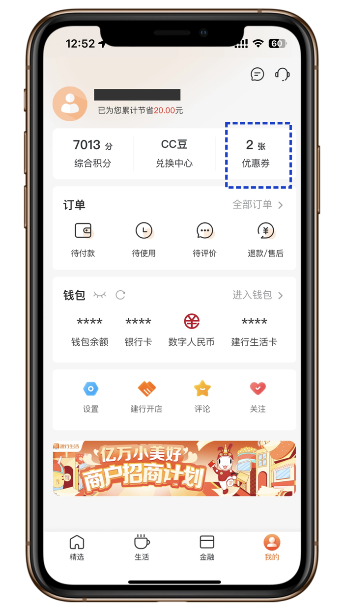 2.用户到店消费时,可通过以下两种方式核销:①出示代金券券码,商家扫码核销代金券,代金券无法覆盖的订单金额,可根据与商家协商选择不同的支付方式(如建行生活在线买单、出示建行生活付款码、现金等);②使用建行生活买单功能,通过建行生活钱包(需升级至最新版本)或龙支付支付时订单金额需大于等于代金券面额。