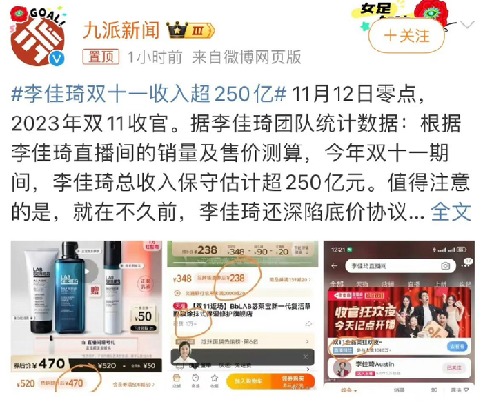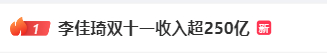 11月13日,有媒体报道称,据李佳琦团队统计数据:根据李佳琦直播间的销量及售价测算,今年双十一期间,李佳琦总收入保守估计超250亿元。其后话题迅速登上热搜。