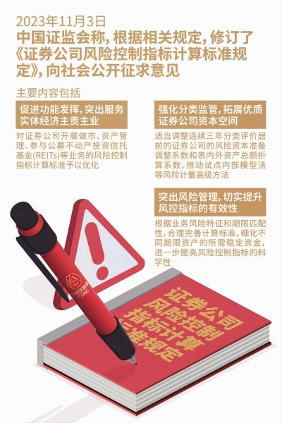 2023年11月3日,证监会就修订《证券公司风险控制指标计算标准规定》(以下简称《计算标准》)公开征求意见。本次调整主要涉及《计算标准》中风险资本准备计算表、表内外资产总额计算表、流动性覆盖率计算表、净稳定资金率计算表、风险控制指标监管报表等5张计算表。