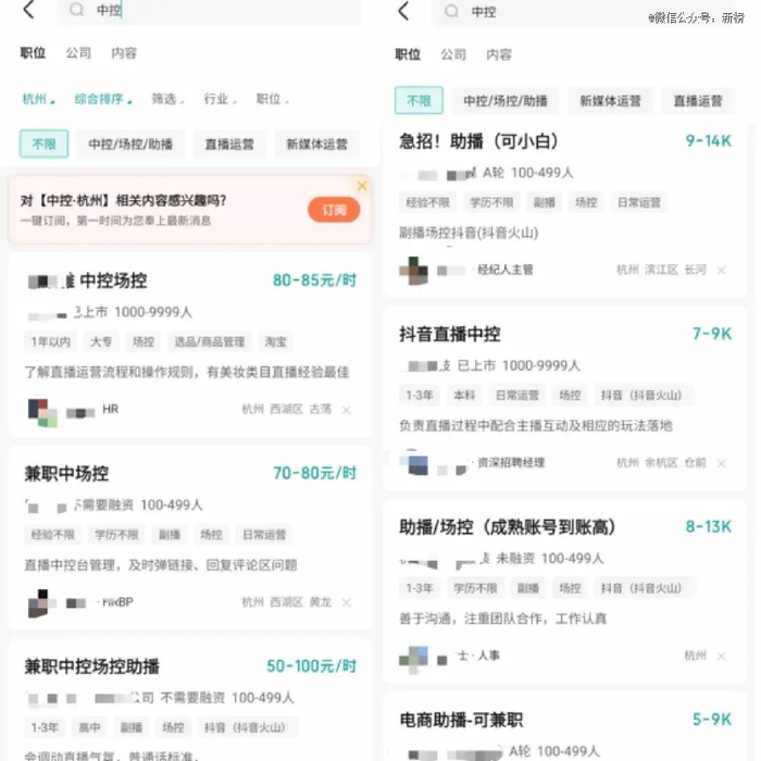 在Boss直聘搜索杭州的“中控”岗位显示,兼职薪酬往往在每小时50元至100元,全职的薪资范围集中在5000元至13000元左右。