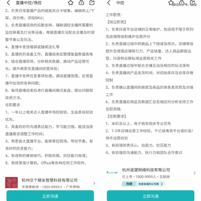 以杭州头部MCN公司为例,薪资7000元至10000万元的中控岗位职责显示, 不仅需要配合主播互动,还需要做好直播前的准备工作,执行直播玩法落地,维护日常店铺运营,跟进直播后的复盘并提出改进方法。