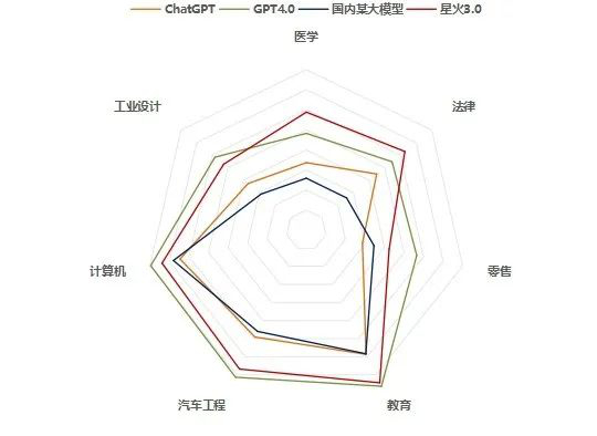 据了解,此次测评选取星火大模型3.0版、ChatGPT、GPT-4和国内某大模型为测评对象进行对比,测评行业方面选择了知识密集型的生产性服务业(法律服务与工业设计)、个性化需求高的生活性服务业(医疗、教育与零售)以及部分制造业(汽车工程、计算机),并基于临床执业医师资格考试、中医执业医师资格考试、国家统一法律职业资格考试、机动车检测维修专业技术人员执业资格、全国计算机技术与软件专业技术资格等权威职业资格考试构建了测评题目,以评估大模型在行业知识、技能掌握水平、生产经营场景理解能力等维度的表现。