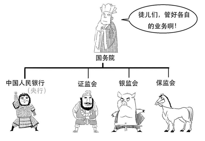 唐僧的4个徒弟分别代表了央行、银监会、保监会和证监会。