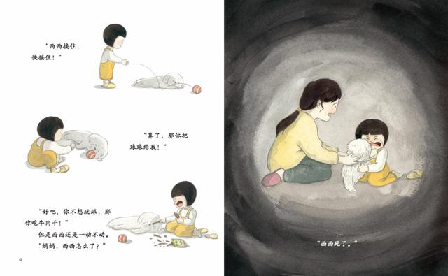 这是一本关于死亡与生命教育的原创绘本。女孩的小狗死了,她无法接受不可避免的失去,她哭、埋怨妈妈、陷入沮丧,直到妈妈拿出小狗的相册,母女俩一起看照片回忆起过去。当妈妈掉下了悲伤的眼泪,女孩抱住妈妈说:“妈妈不怕,你还有我。”当母女俩去到埋着小狗的树下时,她们用自己的方式和小狗说“再见”。