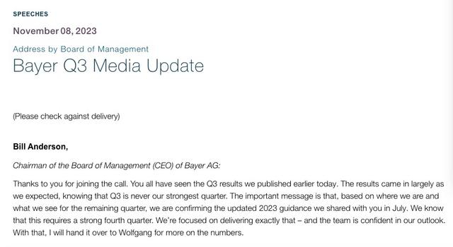 比尔·安德森表示,拜耳下调2023年的全年原定目标。事实上,早在半年报公布后,由于草甘膦制品销售的继续大幅下降,拜耳就下调2023年全年的展望,包括预计销售额将在485亿欧元到495亿欧元之间,而最初的预测区间为510亿欧元-520亿欧元;将核心每股收益在汇率调整的基础上由7.20欧元-7.40欧元调整至6.20欧元-6.40欧元,预计作物科学部门的销售额将同比下降约5%,最初预计则是增长约3%。