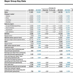 德国制药企业拜耳近期公布三季度报,在实现103.42亿欧元(约805.81亿元)销售额的情况下,单季度亏损45.69亿欧元(约355.53亿元)。CEO比尔·安德森(Bill Anderson)在三季度业绩电话会上表示,拜耳将考虑分拆消费者健康或作物科学部门。