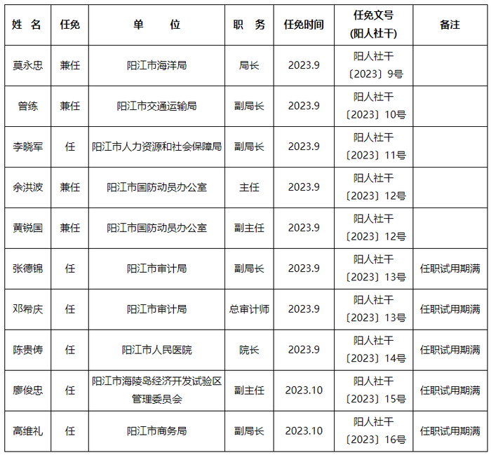 2023年10月阳江市政府部门副处级以上干部任免情况: