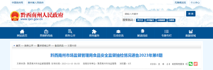 贵州省黔西南州市场监管局发布2023年第8期食品安全监督抽检情况