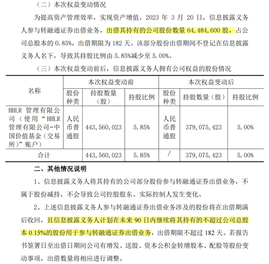 这意味着,HHLR参与转融通证券出借业务合计借出1%股份,其持股比例将降至4.85%。