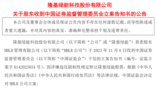 11月8日晚,隆基绿能发公告称,公司股东HHLR因涉嫌“违规减持”被中国证监会立案调查。