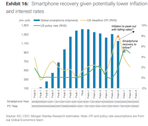 考虑到通胀下行带来的周期性需求复苏和边缘人工智能的积极影响,摩根士丹利上调了全球智能手机出货量预测。