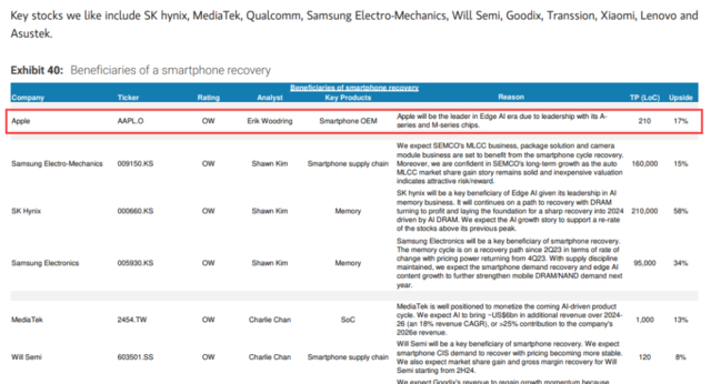 另外,摩根士丹利仍看好苹果,认为苹果依赖苹果系列产品和M系列芯片的领先地位,将成为边缘人工智能领域的最大赢家。