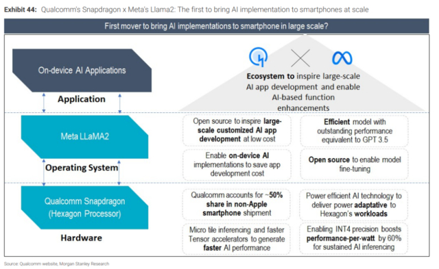 尤其是,Llama2与高通展开了战略合作。高通在非苹果智能手机市场占据领先地位,而且其Snapdragon平台由Hexagon处理器支持,具备强大的人工智能功能。这种合作创造了协同效应,为大规模的智能手机应用程序开发和功能增强构建了一个生态系统。