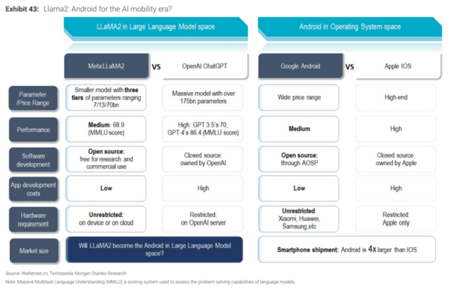 摩根士丹利认为,Llama2很可能成为移动时代的安卓,因为它是迄今为止最具成本效益的开源LLM,性能大致相当于 GPT 3.5。这意味着它能够提供先进的自然语言处理能力,而且成本相对较低。