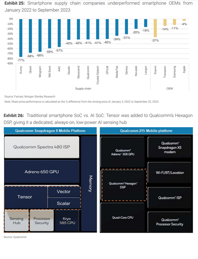 自2022年智能手机市场下滑以来,供应商已经经历了最大的股价调整。例如,从2022年1月至2023年9月,高通、联发科、Sunny、Qtech和Wingtech的股价都出现了显著的下跌,而智能手机制造商的股价表现相对更为强劲。