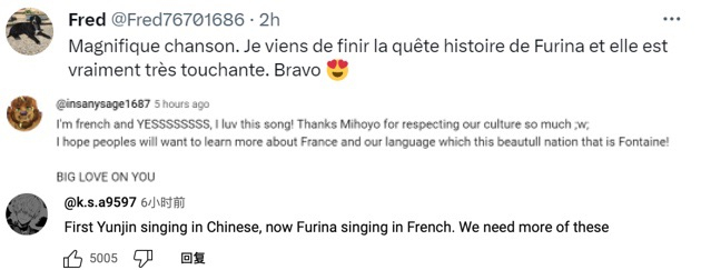 值得一提的是,此次《轻涟》也成为法国网友热议的话题,作为由中国团队创作的法语歌曲,一定程度上促进了不同文化之间的交流。有法国网友表示,“这首歌真好听。我刚看完芙宁娜的故事,真的很感人。”还有法国网友点赞了《原神》枫丹地区对法国文化元素的运用。“我是法国人,是的,我爱这首歌!感谢米哈游如此尊重我们的文化。我真希望大家能更多地了解法国和我们的语言。”