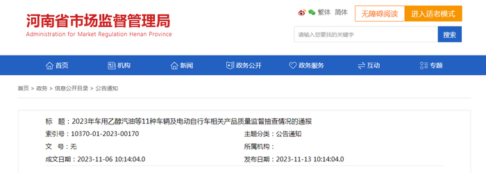 河南省市场监督管理局通报2023年车用乙醇汽油等11种车辆及电动自行车相关产品质量监督抽查情况