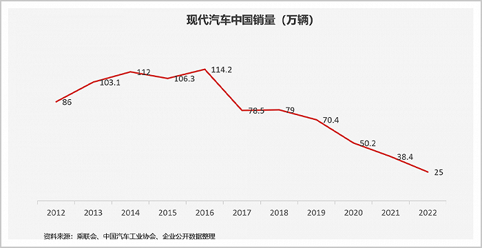 现代汽车在中国的日子,已经如王小二过年,一年不如一年了。销量从2016年顶峰时的114万辆狂跌至2022年的25万辆,实现华丽丽的六连跌,腰斩之后再腰斩。
