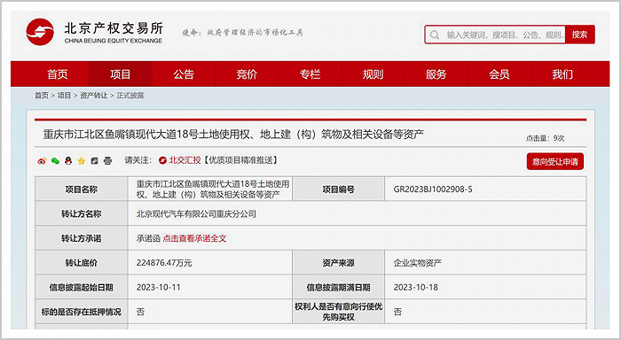 10月11日下午,北京现代汽车有限公司重庆工厂在北京产权交易所第三次挂牌,包含年产能整车30万辆、发动机20万台的整车设备、五大工艺车间、工厂的土地使用权以及诸多不动产,以22.5亿打包出售。