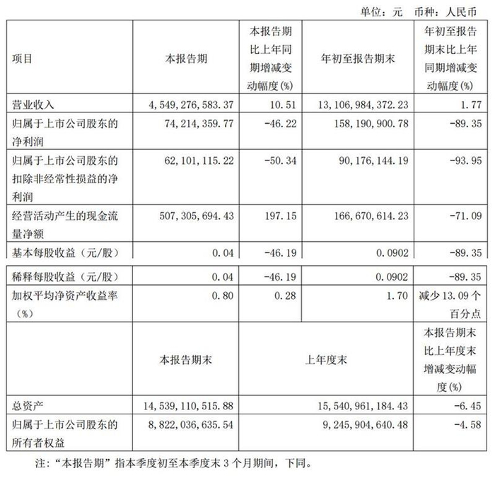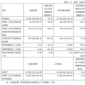 盛和资源发布三季度业绩报告显示:2023年前三季度营收约131.07亿元,同比增加1.77%;归属于上市公司股东的净利润约1.58亿元,同比减少89.35%;基本每股收益0.0902元,同比减少89.35%。