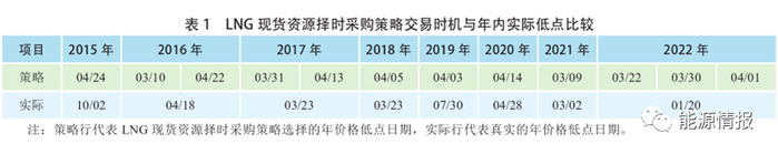 使用JKM现货和纸货历史数据对LNG现货资源择时采购策略进行回测,由于JKM纸货市场近几年才迅速发展,数据记录仅从2015年开始,因此,回测从2015年到2022年。从回测情况看,除2015年、2019年和2022年以外,LNG现货资源择时采购策略交易点采购时机选择与年内实际低点较接近,较好地把握贸易时机。2016年和2017年LNG现货资源择时采购策略触发了两次现货交易,2022年触发了三次现货交易,其余年份触发了一次现货交易(见表1)。2015年、2019年和2022年虽未能在年内低点窗口进行交易,但策略交易价格与实际低点差距较小。