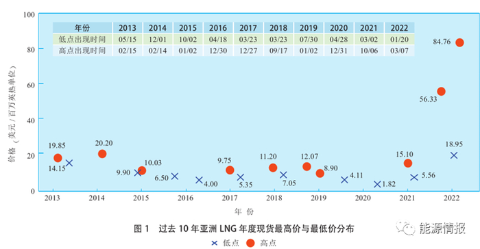 从过去10年亚洲LNG年度现货价格最高点与最低点分布来看,LNG现货价格低点基本都出现在淡季货物交易窗口,高点出现在旺季货物交易窗口(见图1)。2013—2022年,有7年价格最低点出现在淡季交易窗口,其中有6年出现在春季入夏交易窗口。亚洲LNG年度现货价格最高点分布更加明确,10年间9年最高点都出现在供暖季货物交易窗口,只有在2022年3月,俄乌冲突暴发初期,JKM价格在3月超过80美元/百万英热单位的历史最高水平。