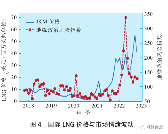 近年来,全球LNG价格波动剧烈,市场恐慌情绪成为影响国际LNG贸易的重要因素。早期学者使用机器学习构建了全球地缘政治风险指数,从2021年下半年开始全球地缘政治指数大幅波动,亚欧LNG价格波动明显上升,地缘政治摩擦带来的情绪变化对国际LNG市场产生影响(见图4)。