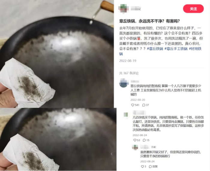 小红书中,一消费者发帖求助,“章丘铁锅,永远洗不干净?有害吗?”高赞网友评论,“章丘铁锅纯纯的智商税,营销用纯手工做卖点,误导消费!”“商家所谓养锅,无非就是炒菜完了保留油脂,这样多次加热油脂必有毒素。”除了避雷“章丘铁锅”的帖子,小红书中还充斥着大量售卖章丘铁锅的商家发布的软广。