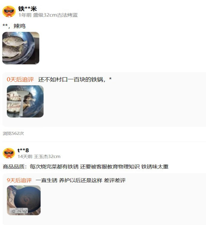 在抖音平台,博主“翔翔大作战”购买了一口1800元的章丘铁锅,在视频中,博主根据商家的教程开锅、养护,却依旧出现了粘锅等问题。而在小红书平台,不少消费者则纷纷“吐槽”自己购买的章丘铁锅货不对板,与宣传中的效果大相径庭,甚至不少消费者发帖传授鉴别真假章丘铁锅的“秘诀”。