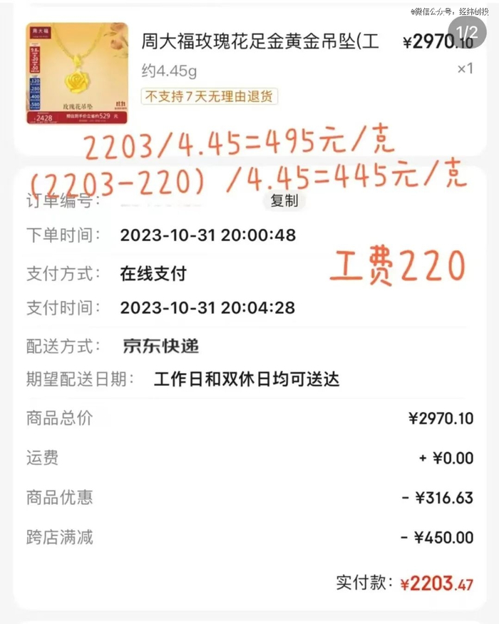 Emily在某官方旗舰店选择了两款金饰,一个玫瑰花足金吊坠是她最想要的,另一个是为凑够3800减300的活动。付款成功后,她又把原本不需要的那个耳环退掉。最后,她用2203元就抢到了4.45克的黄金吊坠,扣除工费220元,每克黄金价值445元。