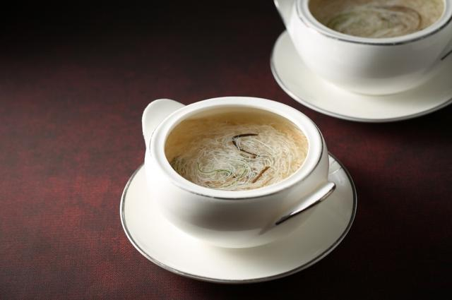 文思豆腐羹是淮扬菜中的一道经典名菜,最能体现主厨的刀工。只见“金陵刀客”李厨拿出他使用了二十多年的菜刀,一如江湖拔剑而出的侠客,在一块豆腐上专注地用片刀法、推刀法、直刀法等手法不停操作。片刻工夫将切好的豆腐放入一个装水的玻璃器皿中,只见豆腐丝如菊花一般,在水中盛开,真的是细如发丝。现场品鉴嘉宾看了后,啧啧称奇对李厨的点评是刀功精湛,将淮扬菜品的刀法精酿于心,别具一格。