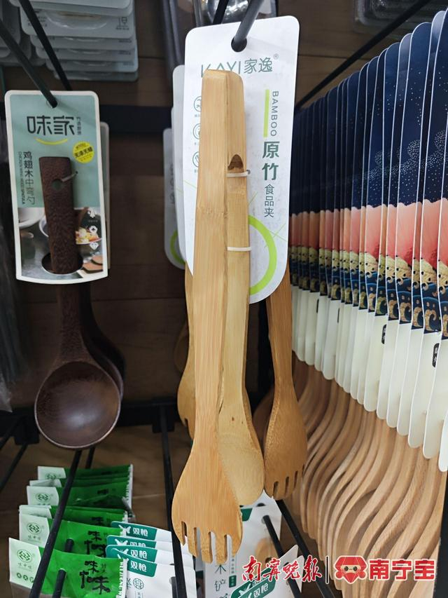 记者走访南宁市多家大型连锁超市发现,不少竹制品赫然占据货架,“抢”占塑料制品位置。在广百汇超市梦之岛江南店日用品区货架上,竹砧板、竹纸巾盒、竹菜刀架、竹饭勺、竹隔热垫等竹制品琳琅满目,制作工艺非常精良。