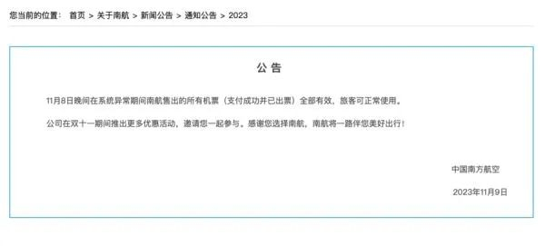 11月9日,南航发布公告称,11月8日晚间在系统异常期间南航售出的所有机票(支付成功并已出票)全部有效,旅客可正常使用。
