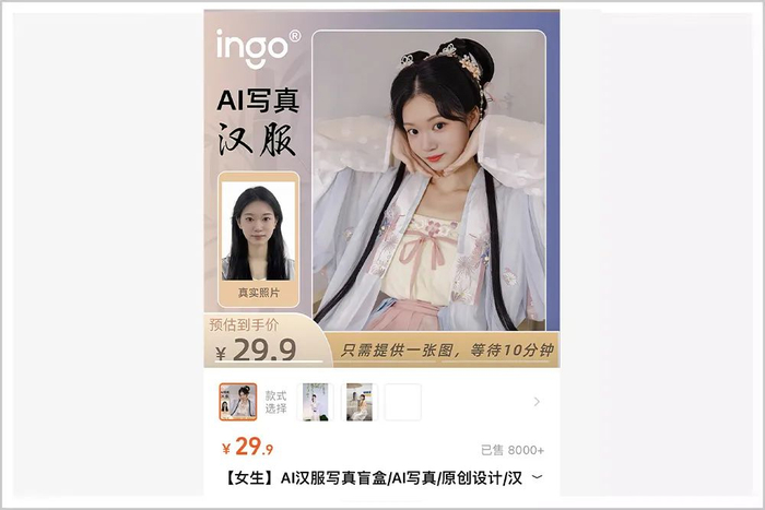 据“图灵说”的创始人星亦介绍,他们团队赶在双11前夕,在店铺中上架了很多基于AIGC的商品服务,目前卖得最好的是AI汉服写真以及有官方授权的杨超越AI语音包,其中AI汉服写真的下单量已经突破8000单。