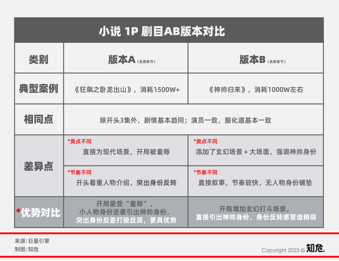 同一剧本为了提升测出率,会设计成 AB 两个版本 ( 免费章节 ),制作团队会提高小成本预算,通过设置不同的爽点,在付费章节之前翻拍两个版本,营造出人物差、故事差,打造不同的反转,形成差异化,吸引用户付费。