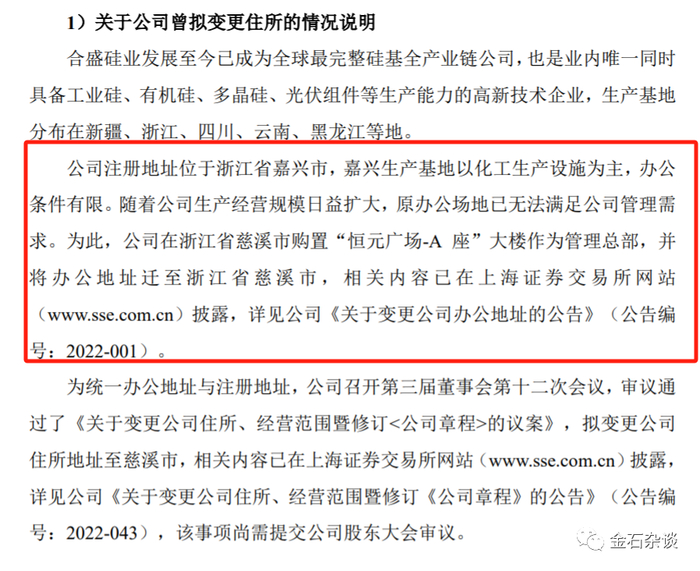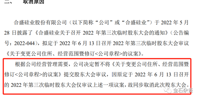 不过,合盛硅业的澄清则显得轻描淡写,合盛硅业搬迁主要是因为经营规模扩大,现在的办公地址已无法满足要求。当时给出的取消原因更加的轻描淡写,因维持相关资质,因当天只有一项议案。