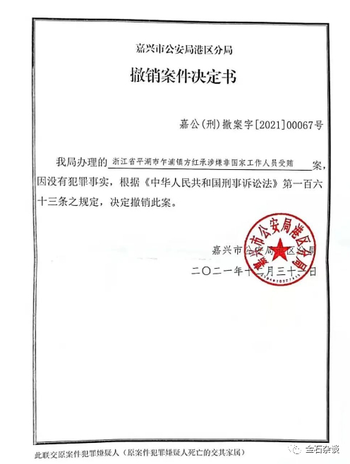 方红承妻子是这么说的:罗立国败诉后,2019年和2021年,他先后两次以背信损害公司利益、职务侵占等罪名向嘉兴港区公安局对方红承提出刑事控告。但最终,公安机关出具的决定书显示,我局办理的XX案经调查以“没有犯罪事实”而未予立案或立案后又撤销案件。