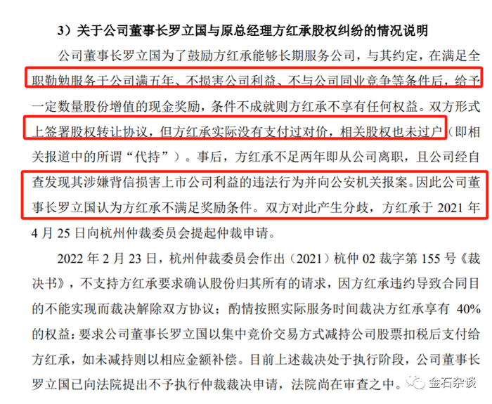 根据合盛硅业公告,合盛硅业主要强调的是股权转让。合盛硅业表示,方红承勤勉服务满足5年,不损害公司利益条件下,给予一定数量股份增值的现金奖励,为此签订了股权转让协议,但方红承没支付过对价,也没有过户。事后,方红承不足两年即从公司离职。然后双方进入仲裁,仲裁判给方红承40%权益,但罗立国没予执行,法院尚在审查中。