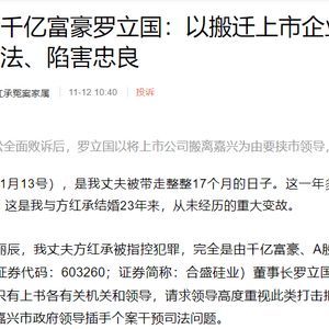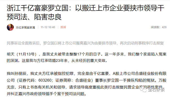 昨日,合盛硅业卷入风口浪尖,12日,孙丽辰(原总经理妻子)在网上实名举报罗立国(合盛硅业董事长)在股权官司败诉后,以变更公司住所、搬离嘉兴要挟有关部门导致方红承、方红兴被关押至今。本来今日开庭审理,但庭审已经推迟,今日并未进行公开审理。