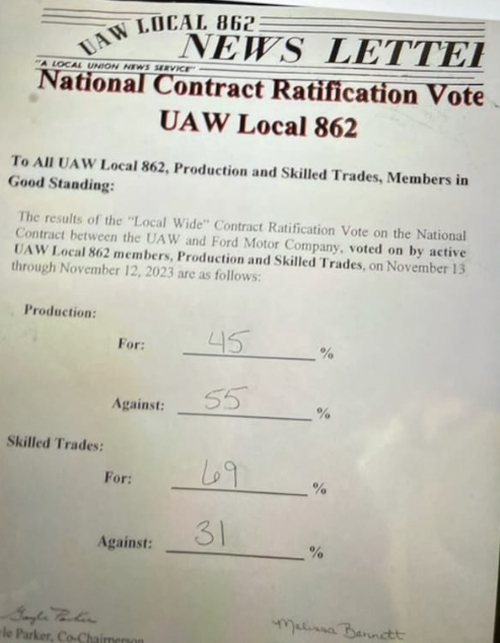 Facebook发帖披露的投票结果显示,在生产工人中,约55%的投票反对新协议、45%的投票支持,在熟练技工中,49%的投票反对、69%的支持。
