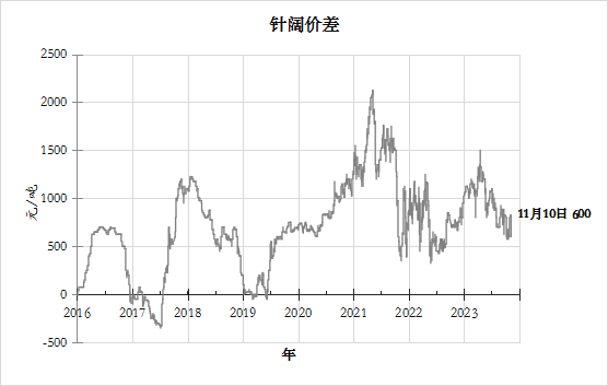 从2022年以来至今一年多的运行来看,针阔差运行区间约为700-800点,而2020年之前几年的平均中轴约为250点,由此可见,在2020年之后,针阔差发生异动,2021年触顶,整体来说,2020年国内禁废之后,针阔价差重心有所上移。