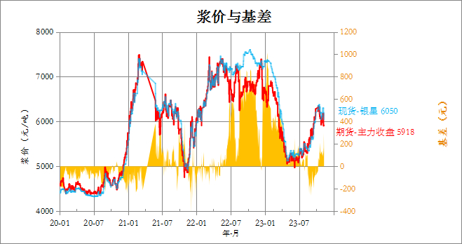 说明:纸浆现货价格采用卓创-山东市场-银星及鹦鹉的现货价格数据,以此计算价差。