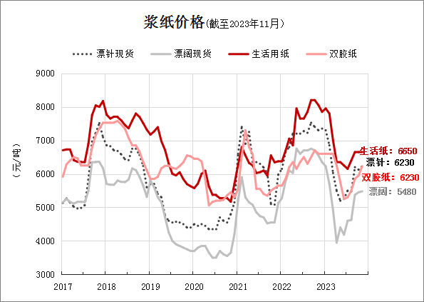 上周纸价相较10月末,持平走强,其中生活纸持平,双胶纸大涨170,或体现旺季来临及乐观预期,市场需求底部回升。单纯从图形上看,纸价上涨动作略落后于浆价上涨速度,即浆先涨,纸后涨,本轮纸价持续上调部分或也受到木浆反弹的推动。