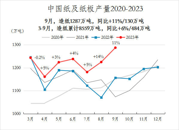 8月、9月,造纸产量加速回暖,同比增幅分别达到14%、11%,而去年8月的造纸产量仍处于淡季低谷,此外,9月份的造纸产量绝对值也为至少2020年来的峰值!由此或能体现随着国内经济温和复苏,叠加浆价回落,造纸产量率先修复,行业生产形势回暖进一步得到确认!