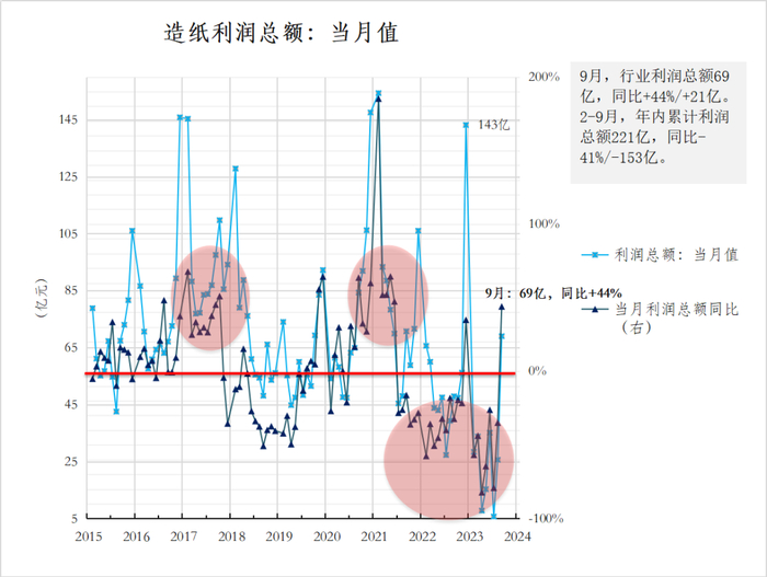 8月-9月,造纸行业生产积极性率先回暖,9月,行业利润绝对值达到69亿,同比增加44%,进一步验证造纸端在经济温和修复、逐步消耗低价浆的背景下,从8-9月开始,造纸的景气度开始复苏。但笔者个人认为考虑到宏观复苏进程缓慢,社会消费或不足以支撑过快、过大的反弹。