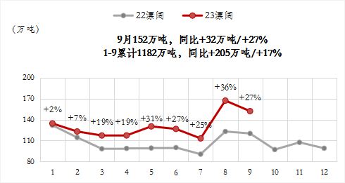 从进口来源国来看,漂阔8月同比增加44万吨主要来自巴西(+13.6万吨)、智利(+10)、印尼(+7.5)、乌拉圭(+5.8)。漂阔9月同比增加32万吨主要来自智利(+9.6)、乌拉圭(+7.7)、印尼(+5.8)。