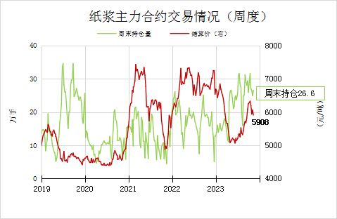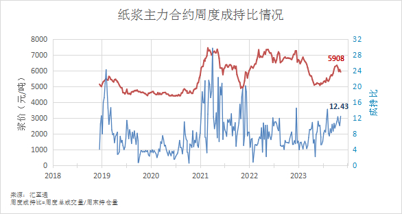 上周,主力合约(SP2401)增仓下行,其结算价环比下跌152点,正好完全抵消前一周的涨幅,期间最高价突破6200,使得周度振幅区间扩至6.3个百分点。日均成交环比增加16万手至66万手的水平,成持比从10跃至12。近四周以来,浆价在5900-6100的区间窄幅震荡,显示出浆价上涨有放缓的态势。持仓量增加1.7万手,以按单边计算的持仓量为依据、以10%为保证金率计算,资金一周涌入约0.6亿,也正好是前一周涌出的资金量。